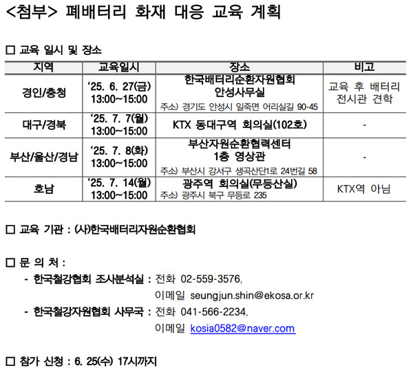 이번 교육은 ▲리튬 2차전지의 구조 및 화재 위험성 ▲혼입에 따른 화재 발생 원리 ▲스크랩 선별·운송 시 안전관리 요령 ▲실제 산업현장 사례 등을 중심으로 구성된다. 실무 중심의 프로그램을 통해 즉각적 대응 능력을 높이는 데 초점을 맞춘다.
