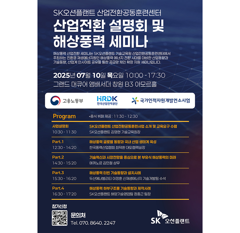 참가 자격은 해상풍력 산업에 종사하거나 진입을 준비 중인 기업 임직원이라면 누구나 무료로 참석할 수 있다. 참가 신청은 네이버폼(세미나 안내 포스터 하단 QR코드 스캔, https://naver.me/5IiJlS27)을 통해 가능하며, 행사 관련 문의는 SK오션플랜트 기술교육원(070-8640-2247)으로 하면 된다.