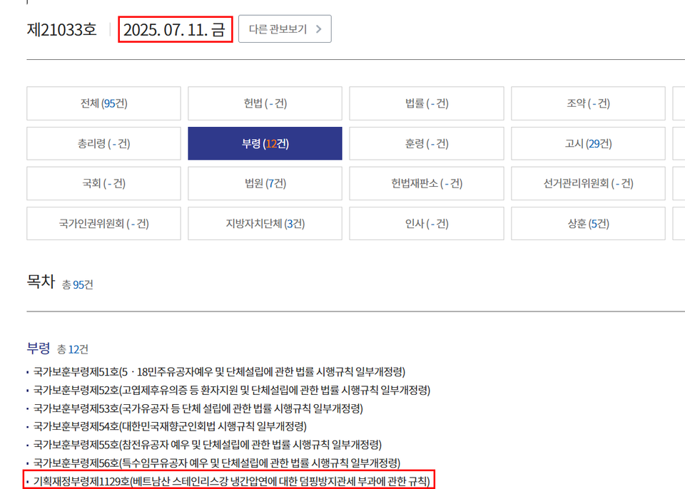 본지가 전자관보를 통해 확인한 결과 7월 11일(금)부터 관세 부과를 시행될 것으로 보인다. 7월 11일부터 통관되는 베트남산 스테인리스 냉연에는 기존 잠정관세가 아닌 11.37~18.81%의 최종 관세가 부과될 예정이다.