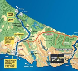2025년부터 2040년까지의 인프라 정비 계획에는 '비전 2053'을 기반으로 한 국가 전략이 포함되어 있으며, ① 탄소 중립 경제로의 전환 ② 에너지 자립 국가의 실현 ③ 지리적 우위를 활용한 국제 물류 허브화가 주요 목표이며, 에너지 인프라 다각화 측면에서는 ➀ 재생가능 에너지 확대(풍력, 태양광, 지열 등) ② 원자력 발전소 건설(예: 아크유 원전) ③ 가스 파이프라인 다각화(러시아 의존도 감소) ④ 그린 수소 기술 도입 및 연구 개발이 언급되고 있다. 그리고 구체적인 국제 프로젝트로 ➀ 카날 이스탄불 간 약 45km의 인공 운하 계획(보스포러스 해협의 대체 운하—우측 도면) ② 순환 철도 계획(유럽과 아시아 간 화물 운송루트 구축) ③ 중동 및 중앙아시아와의 에너지·교통 연결프로젝트 확대가 계획되고 있다.