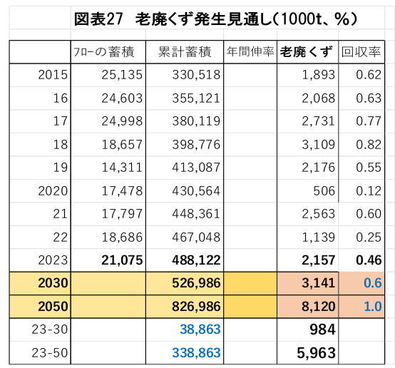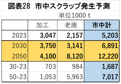예측 결과, 2030년의 노폐 스크랩 회수 잠재량은 약 100만 톤 증가하여 310만 톤, 2050년은 600만 톤 증가한 810만 톤으로 추정된다.(도표 27). 그 결과 시중 스크랩 총량은 2030년 170만 톤 증가한 6억 9,000만 톤, 2050년 170만 톤 증가한 6억 7,000만 톤으로 690만 톤, 2050년은 700만 톤 증가한 1,220만 톤이다. 또한 가공 스크랩 대 노폐 스크랩 비율은 2023년 51.5 대 48.5는 2030년에는 54.4 대 45.6으로 2050년은 33.6 대 66.4로 크게 변하지 않지만, 선진 철강회사와 비슷해 질 것이다. (도표28).