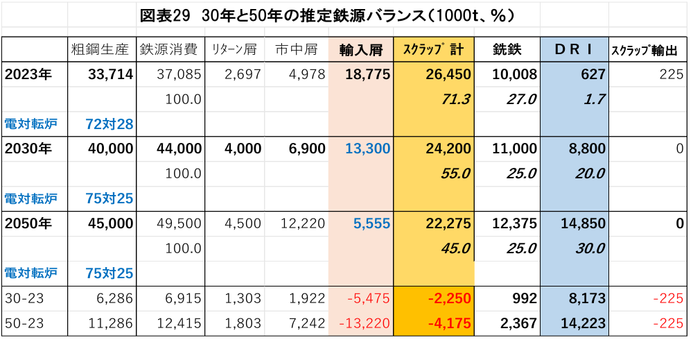 2050년: 조강 생산량은 4,500만 톤으로 확대되며, 필요한 철원도 5,000만 톤에 육박할 것이다. 이 시기에 고로는 수소 환원으로 전환되어 계속 운영될 것으로 추정된다. 스크랩은 시중 폐기물 발생량 1,200만 톤을 100% 사용하며, DRI 혼합 비율을 30%로 가정하면 외부 의존량(수입 필요량)은 550만 톤 정도에 그칠 것으로 전망된다. 수입 의존도를 높일지 억제할지는 DRI 투자 여부에 달려 있다. 스크랩의 외부 수급 환경은 낙관할 수 없는 상태이며, 품위 문제도 있어 DRI 생산이 과제가 될 것이다. 덧붙여 주변국에 스크랩을 수출하면 그만큼 수입이 필요하다.