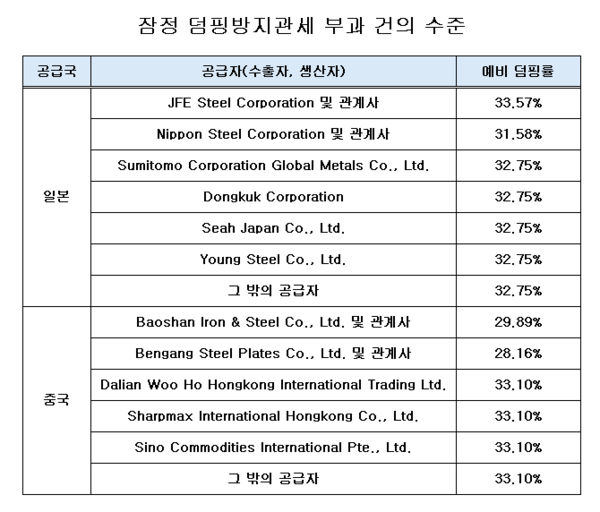 산업통상자원부 무역위원회가 일본 및 중국산 열간압연 강판(열연강판)에 대해 최대 33.57%의 잠정 덤핑방지관세 부과를 기획재정부에 건의하기로 했다.