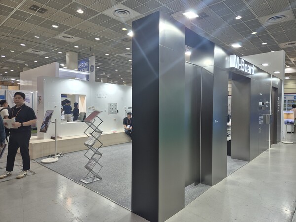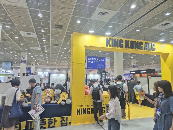 KING KONG ALC 부스는 거대한 노란 아치로 시선을 사로잡았고 내부에는 단열·차음 성능을 강조한 ALC 블록이 배치돼 있었다. M-Board는 화이트보드 기능과 전자 제어 기능이 결합된 신개념 벽체를 선보이며 교육·사무용 공간 솔루션으로 눈길을 끌었다.