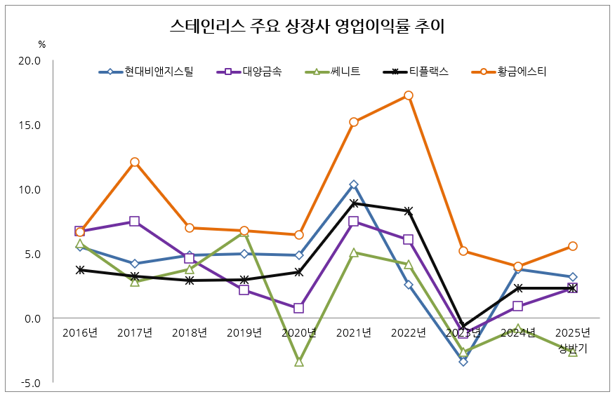 올해 상반기 스테인리스 상장사들의 성적표는 희비가 엇갈렸다. 미국의 관세 부과 이전에 미주와 유럽, 일본 등으로 수출 물량을 늘린 업체들은 달러 강세의 수혜를 입으며 상대적인 실적 개선을 이룬 것으로 보인다. 특히 가전·자동차 등 수출 중심 수요 산업과 연계된 기업들은 상대적으로 양호한 성적을 거둔 것으로 나타났다.