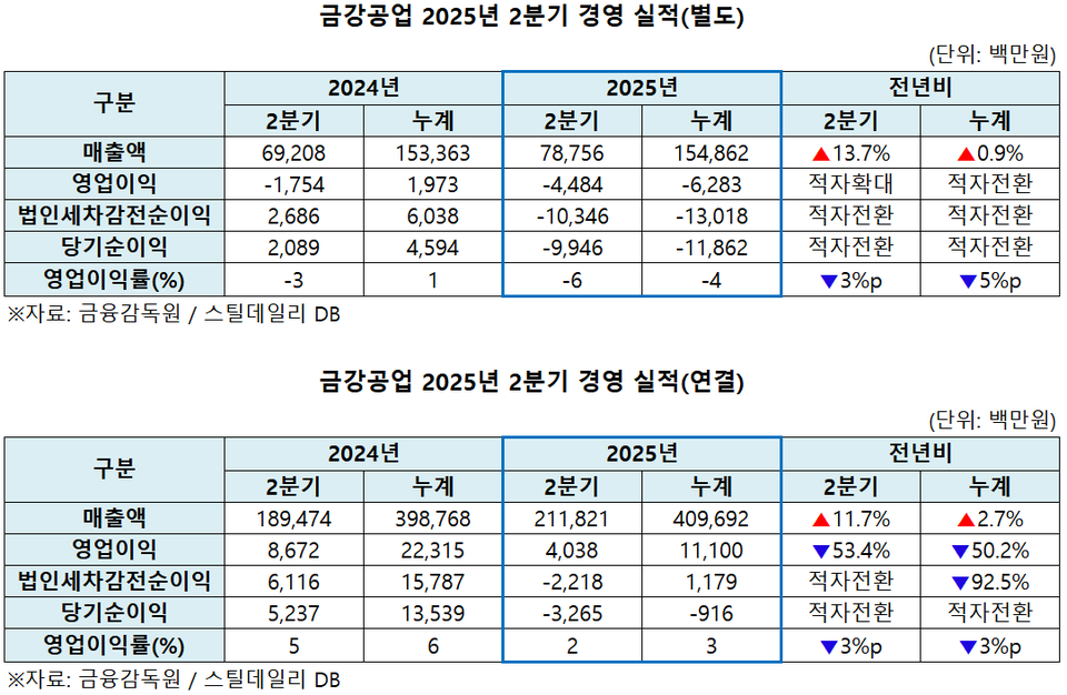 금강공업은 14일 금융감독원에 반기보고서를 제출하고, 2분기 별도 기준 경영 실적에 대해 △매출액 787억 5,600만 원(전년 동기 대비 13.7% 증가) △영업손실 44억 8,400만 원(적자 확대) △순손실 99억 4,600만 원(적자 전환)을 기록했다고 밝혔다.