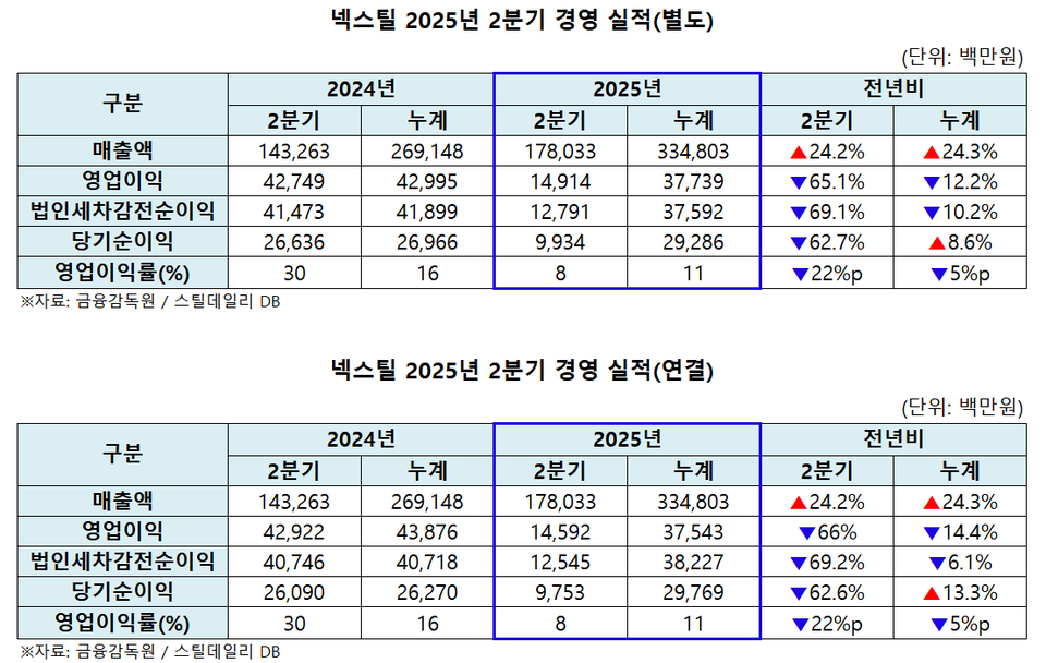 넥스틸은 14일 금융감독원에 반기보고서를 제출하고, 2분기 별도 기준 경영 실적에 대해 △매출액 1,780억 3,300만 원(전년 동기 대비 24.2% 증가) △영업이익 149억 1,400만 원(전년 동기 대비 65.1% 감소) △순이익 99억 3,400만 원(전년 동기 대비 62.7% 감소)을 기록했다고 밝혔다.