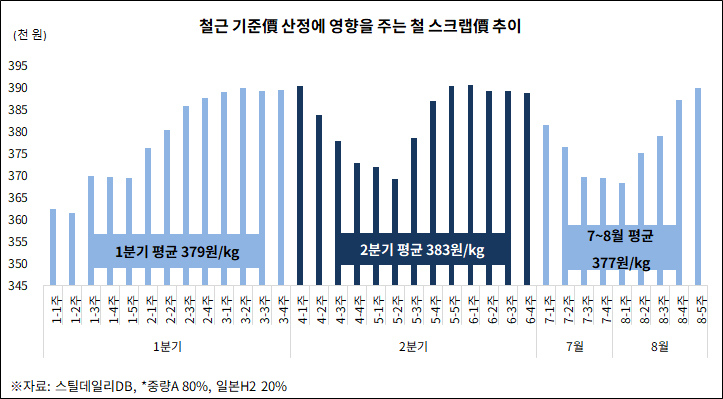 9월 철근 기준가격 조정되기 위해선 3분기 평균 철 스크랩 가격이 2분기 대비 ±5%(톤당 1만 9,000원) 변동되어야 하지만 이를 충족하지 못했다.