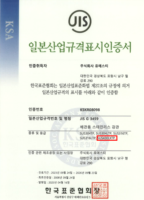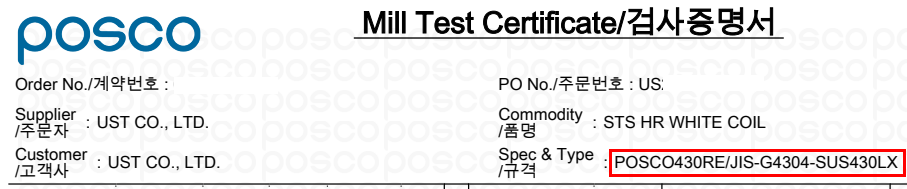 실제 유에스티의 일본산업규격(JIS) 인증서에 ‘SUS430LX’가 명시돼 있으며, 포스코의 소재 증명서(MTC)에는 'POSCO 430RE / JIS-G4304-SUS430LX'로 병기돼 있다.