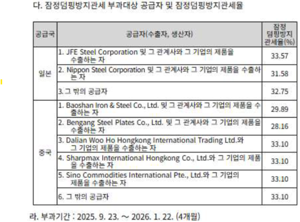 - 日·中 탄소강 열연, 4개월 잠정관세 행정예고