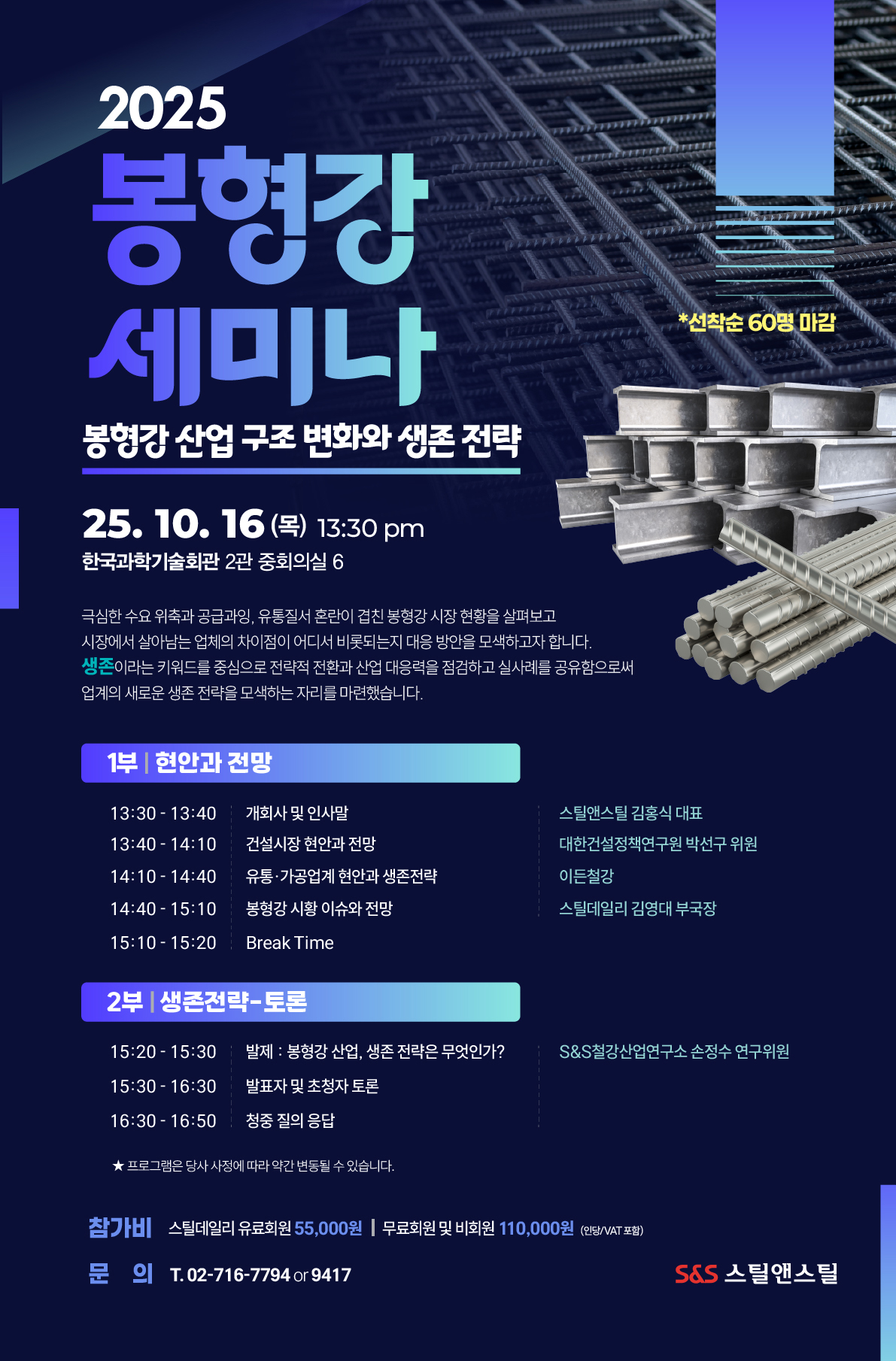 국내 봉형강 산업의 현안을 점검하고 생존 전략을 논의하는 ‘S&S 봉형강 세미나 2025’ 가 오는 10월 16일(목) 오후 1시 30분, 한국과학기술회관에서 열린다.