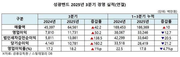 관이음쇠 전문 기업 성광벤드가 올해 3분기에도 견조한 실적 흐름을 이어갔다. 매출과 영업이익 모두 전년 동기 대비 큰 폭으로 증가하며 수익성 회복세가 뚜렷하게 나타났다.