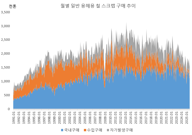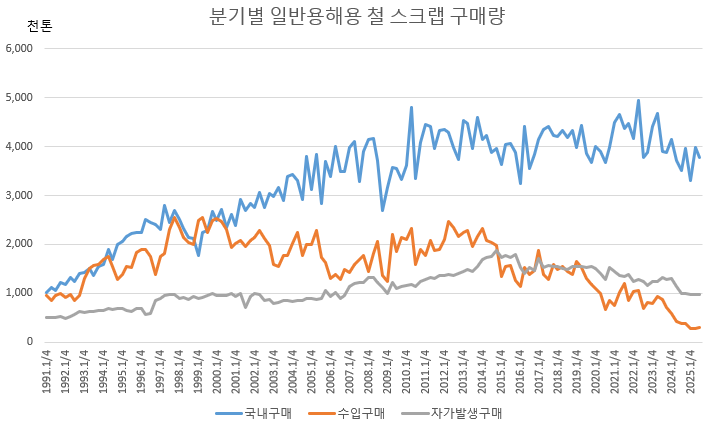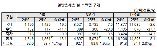 철강 생산이 줄면서 자가발생 스크랩 공급량 감소도 두드러졌다. 9월 자가 스크랩은 31만 5,000톤으로 전년동월대비 0.9% 줄었다. 9월까지 누계로는 293만 6,000톤으로 14.3% 감소했다. 3분기 자가 발생량은 98만 1,000톤으로 전분기와 비슷했다. 전년동기대비 0.6% 감소했다.