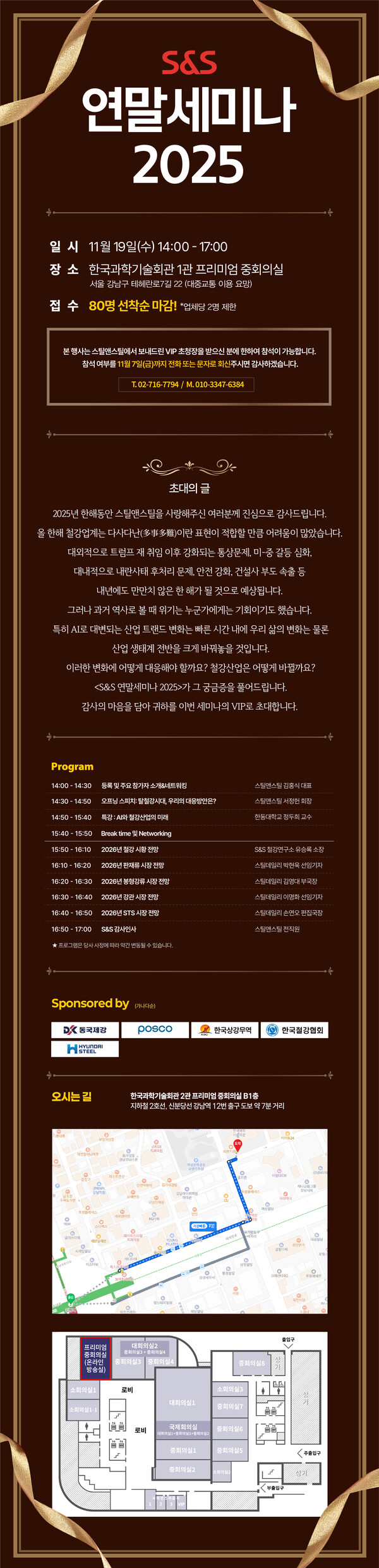 스틸앤스틸이 오는 11월 19일(수) 오후 2시부터 5시까지 한국과학기술회관 2관 프리미엄 중회의실에서 ‘S&S 연말세미나 2025’를 개최한다.