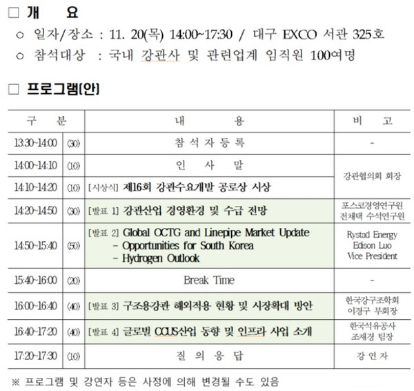 세미나는 14시 개회 후 ‘제16회 강관수요개발 공로상 시상식’을 시작으로 본격적인 일정이 시작된다. 이후 총 4개의 발표 세션이 이어진다.