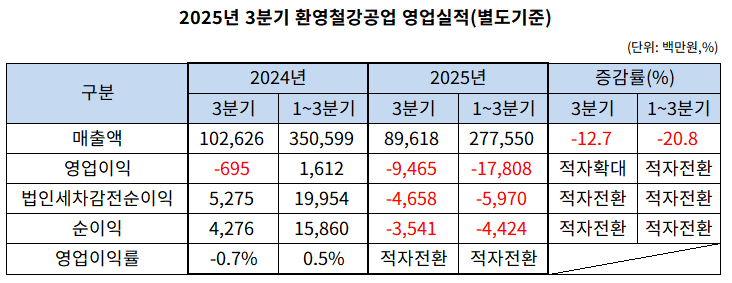 환영철강공업이 2025년 3분기에도 영업적자를 이어가며 수익성 악화가 지속되고 있다.