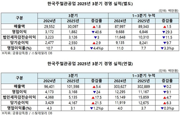 한국주철관공업의 2025년 3분기 별도 기준 매출액은 300억 9,700만 원으로 전년 동기 대비 1.8% 증가했다. 반면 영업이익은 18억 8,200만 원으로 전년 동기 대비 40.6% 감소, 당기순이익은 25억 5,000만 원으로 전년 동기 대비 2.9% 증가했다.