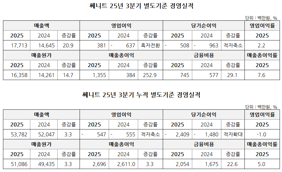 쎄니트가 2025년 3분기 별도기준 매출 성장을 기록했으나, 영업손실과 순손실은 완전히 해소되지 않은 것으로 나타났다.