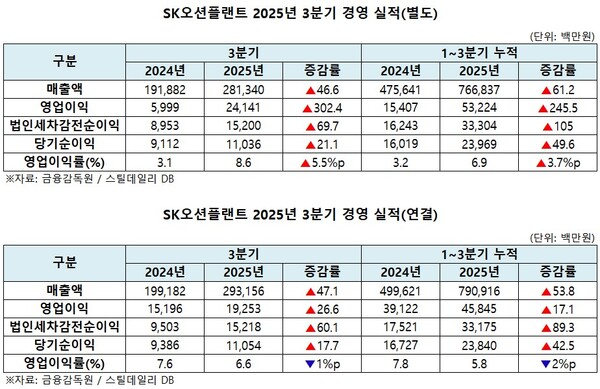 14일 금융감독원 공시에 따르면, SK오션플랜트의 2025년 3분기 별도 기준 매출액은 2,813억 4,000만 원으로 전년 동기 대비 46.6% 증가했다.