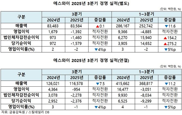 에스와이는 14일 금융감독원에 분기보고서 제출하고 3분기 별도 기준 경영 실적에 대해 △매출액 835억 8,400만 원(전년 동기 대비 0.1% 증가) △영업손실 13억 9,200만 원(적자 전환) △순손실 15억 7,900만 원(적자 전환)을 기록했다. 영업이익률은 2%에서 -2%로 4%p 하락하며 수익성 부담이 크게 확대됐다.