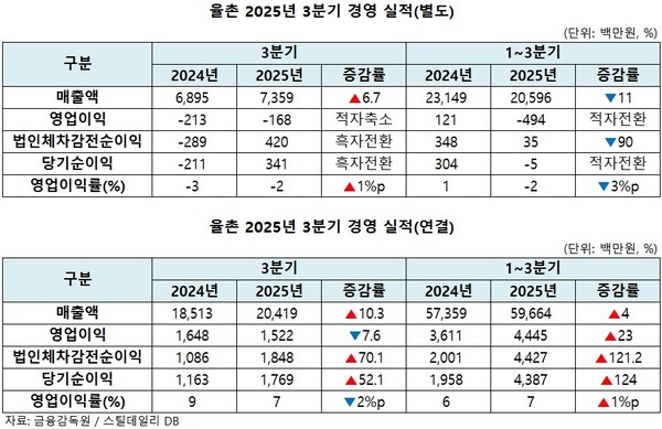 율촌은 최근 금융감독원에 분기보고서를 제출하고 3분기 별도 기준 경영 실적에 대해 △매출액 73억 5,900만 원(전년 동기 대비 6.7% 증가) △영업손실 1억 6,800만 원(적자 축소) △순이익 3억 4,100만 원(흑자 전환)을 달성했다고 밝혔다.