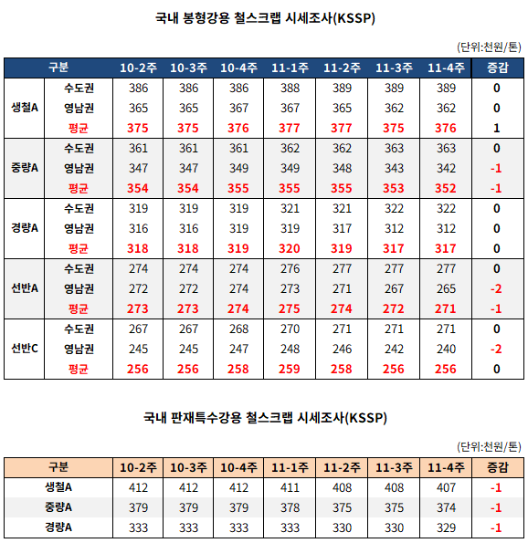 수도권은 환영철강의 구매가격 인하로 환영철강 관계사의 구매가격이 하락했다. 또 동국제강 인천제강소의 특구 해지를 앞두고 일부 업체들이 구매가격을 소폭 내리면서 KSSP가 소폭 하락했다.