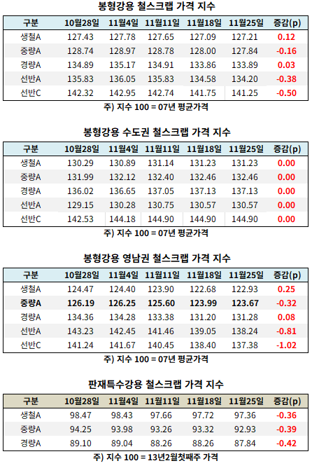 남부지역은 대한제강의 분철류 20원 인하 영향으로 분철 가격을 중심으로 하락했다. 생철은 부산을 중심으로 소폭 상승했다는 응답이 있었지만 지표가격에 영향을 미치지 않았다.