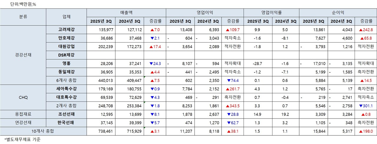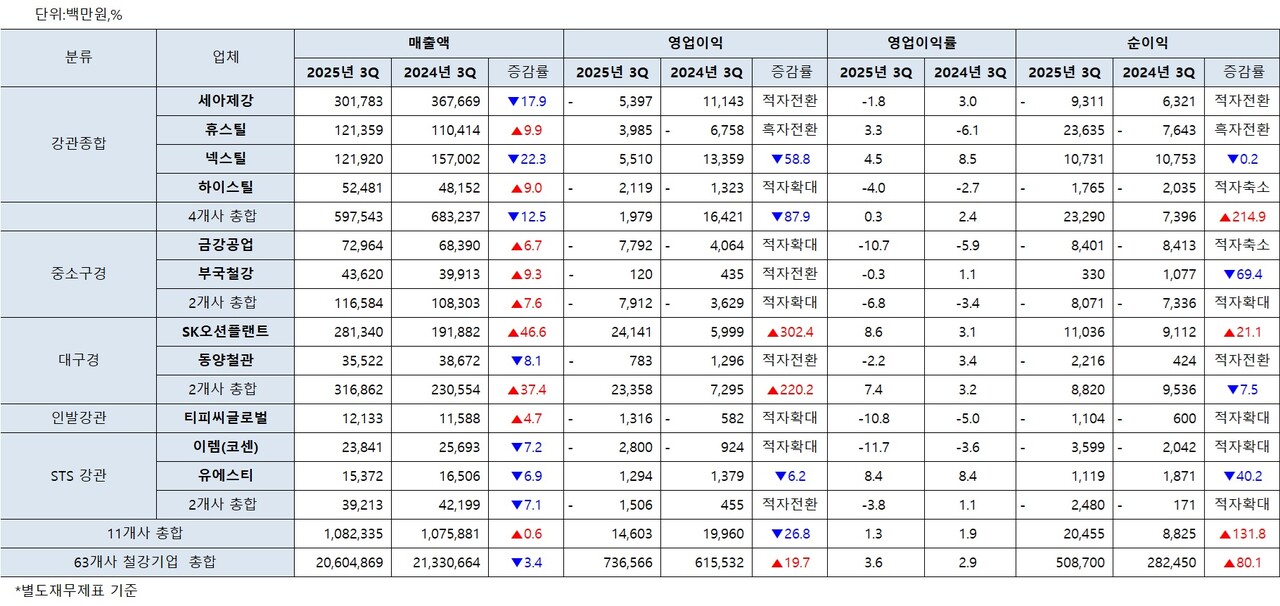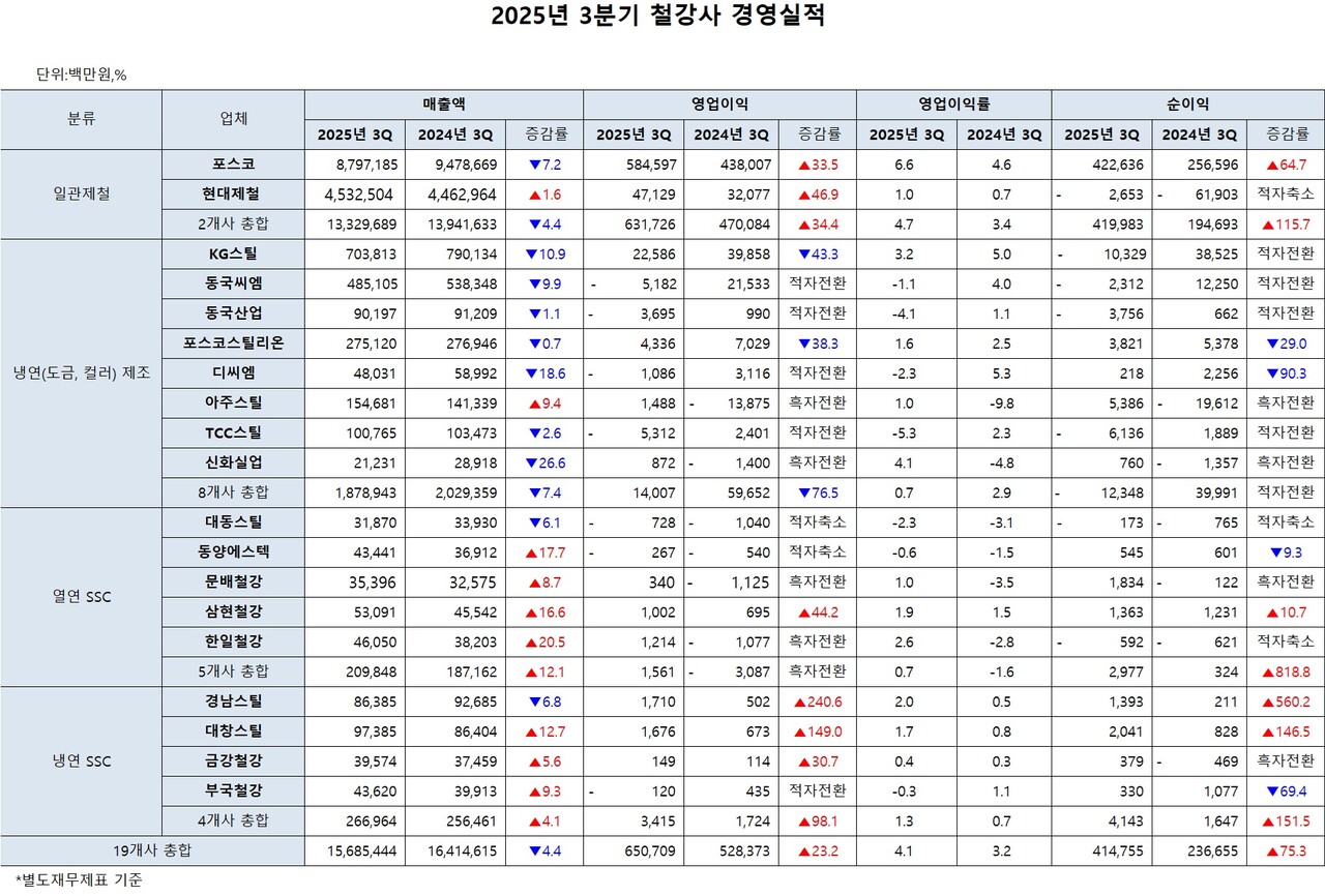 업계 관계자는 “3분기의 개선세가 구조적인 전면 회복으로 이어지기까지는 시간이 더 필요하다”며, “4분기 실적은 건설, 자동차, 조선 등 주요 수요 산업의 회복 속도와 더불어, 고부가 제품 전환, 원가 효율화, 해외 시장 다변화 등 기업별 체질 개선 노력의 성과에 따라 희비가 갈릴 것”이라고 전망했다.
