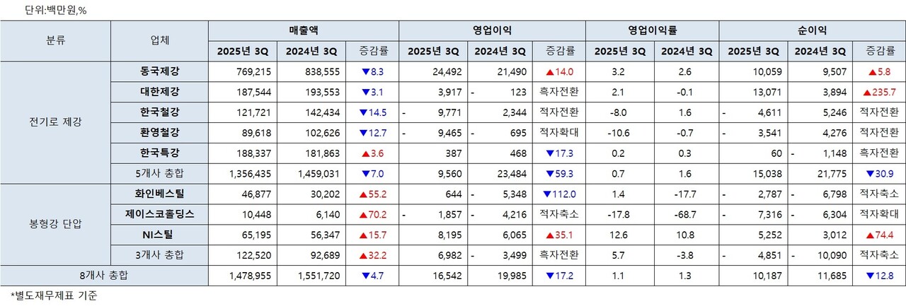 2025년 3분기 국내 철강 상장사들의 경영 실적은 전반적인 매출 둔화 속에서도 영업이익과 순이익이 크게 개선되며 ‘선별적 회복’ 흐름을 보였다.
