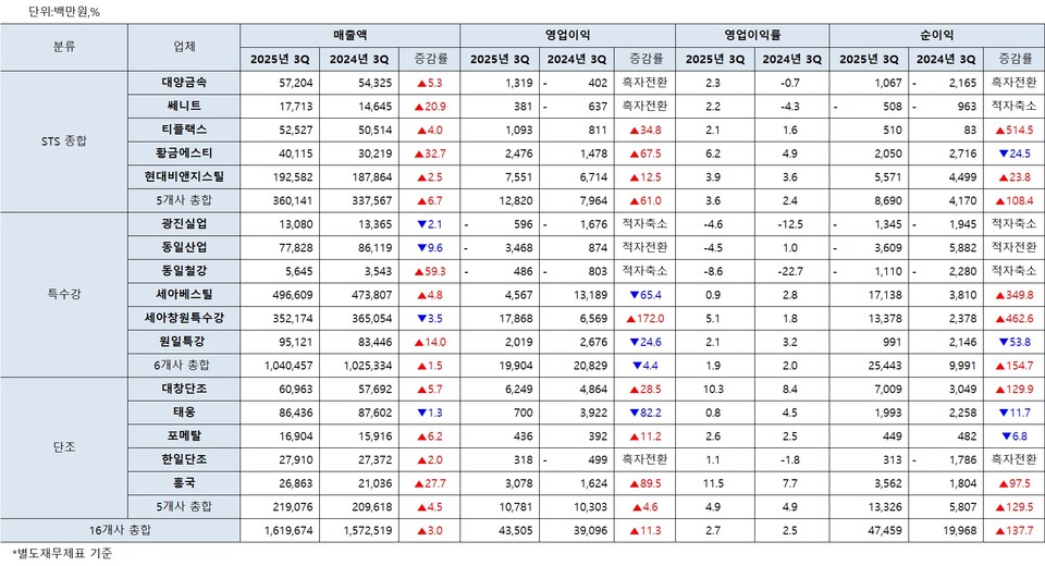 스테인리스 업계의 경우 3분기 온도차가 발생했다. 현대비앤지스틸은 매출 1,926억 원, 영업이익 77억 원, 순이익 56억 원으로 견조한 흐름을 유지했다. 대양금속은 영업이익 13억 원, 순이익 11억 원으로 모두 흑자 전환했고, 티플랙스·황금에스티·성원 역시 실적이 개선됐다. 반면 쎄니트는 매출 증가에도 순손실, 유에스티와 이렘은 매출 감소와 수익성 악화를 피하지 못했다. 업계는 “고부가 제품 확대와 체질 개선이 실적을 견인했지만, 내수 둔화와 원가 변동성이 여전하다”고 평가했다.